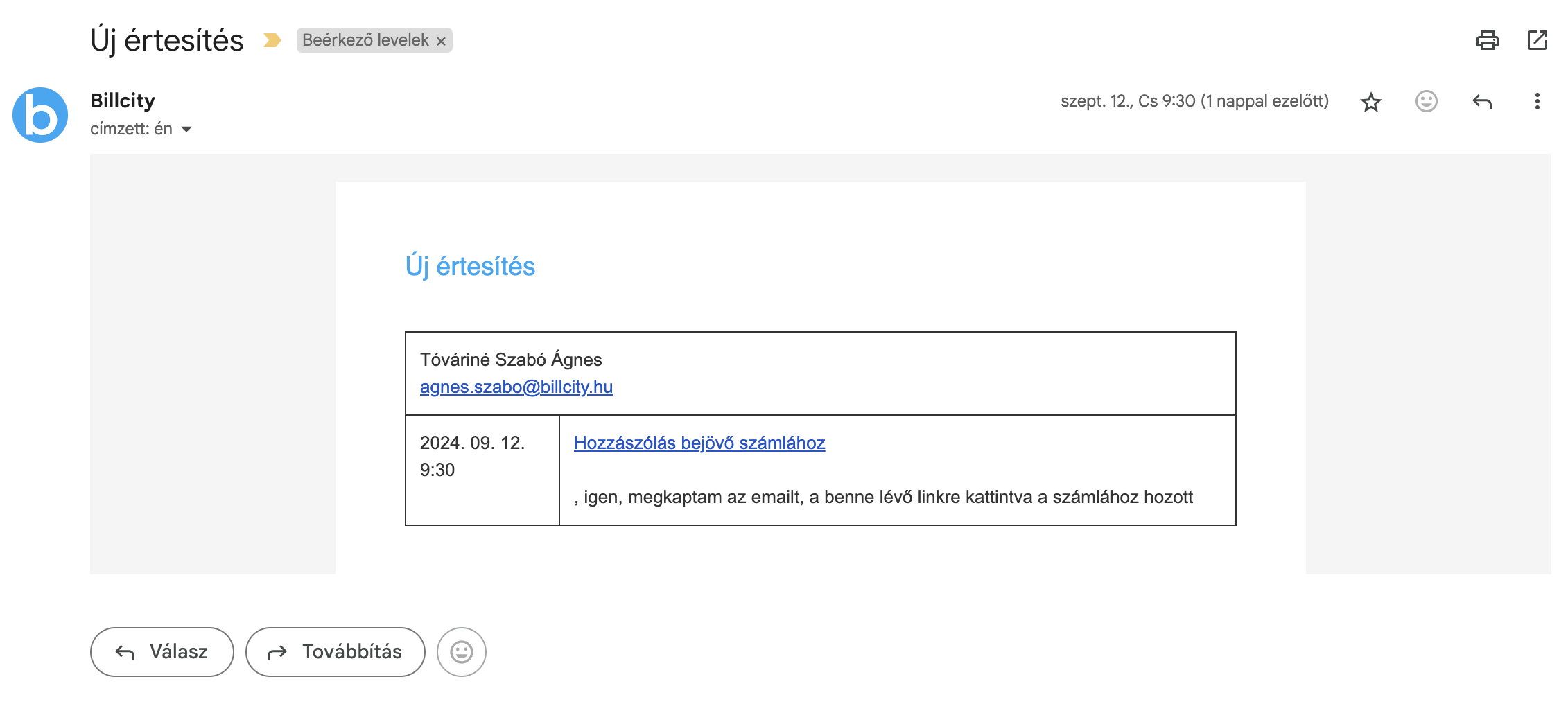 Erre ha rákattint a megszólított felhasználó, akkor a rendszer kiírja, hogy ki és milyen számlával kapcsolatban említette meg. Az üzenetre kattintva rögtön az adott számlához navigál a rendszer.